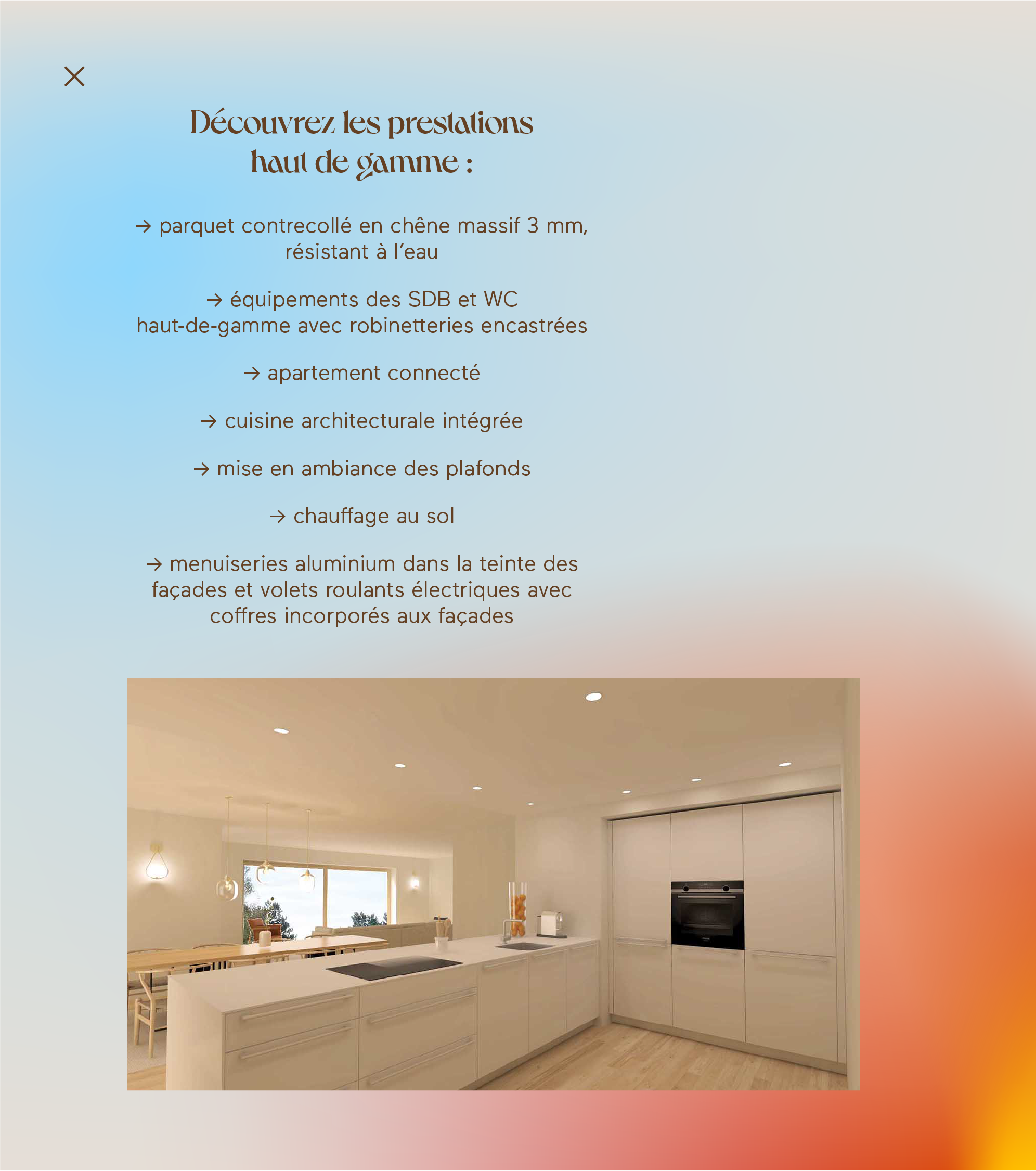 C’est ici que le voyage commence vraiment. Quand on pousse la porte d’entrée de ces appartements d’exception et que l’on découvre les fabuleux volumes, la lumière réconfortante, les détails précieux. La conception des aménagements intérieurs a été pensée et réalisée par un architecte d’intérieur, rien n'est laissé au hasard.